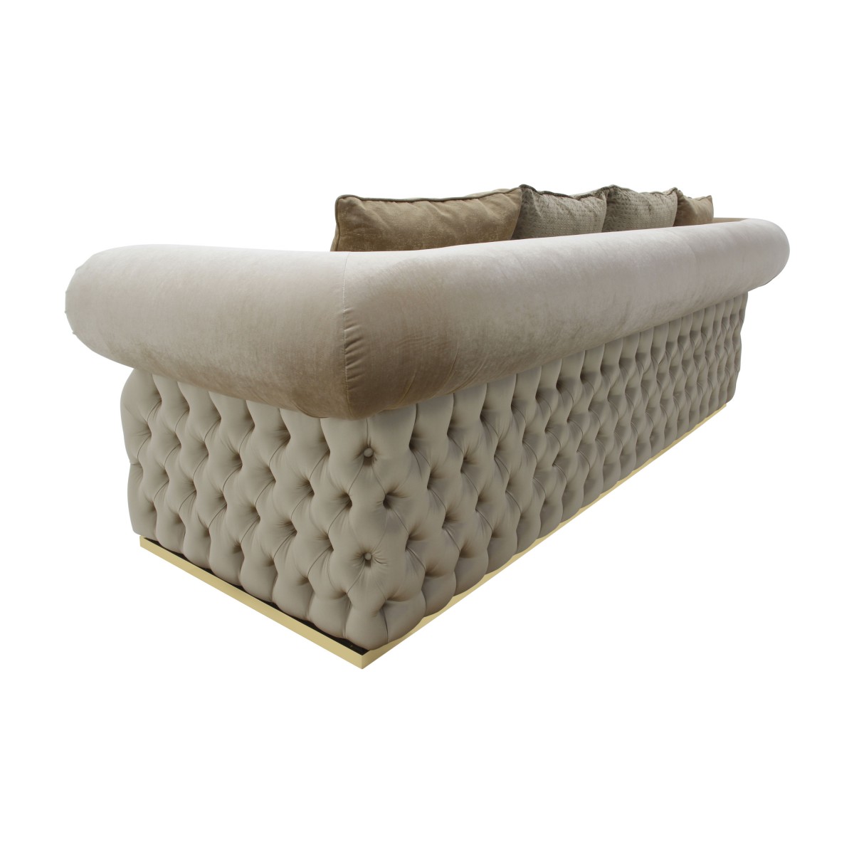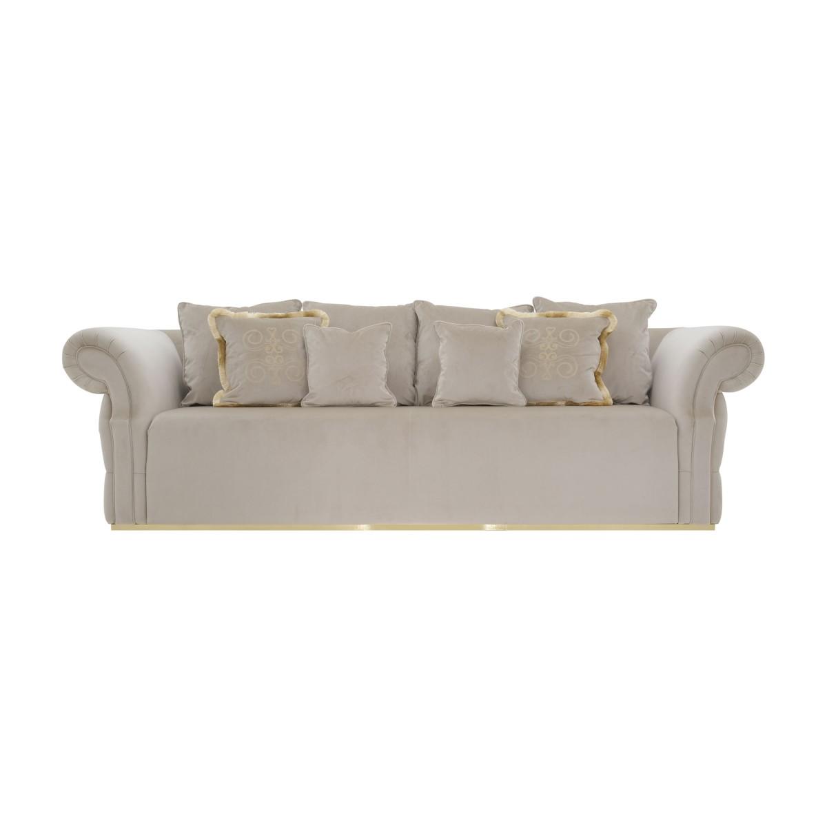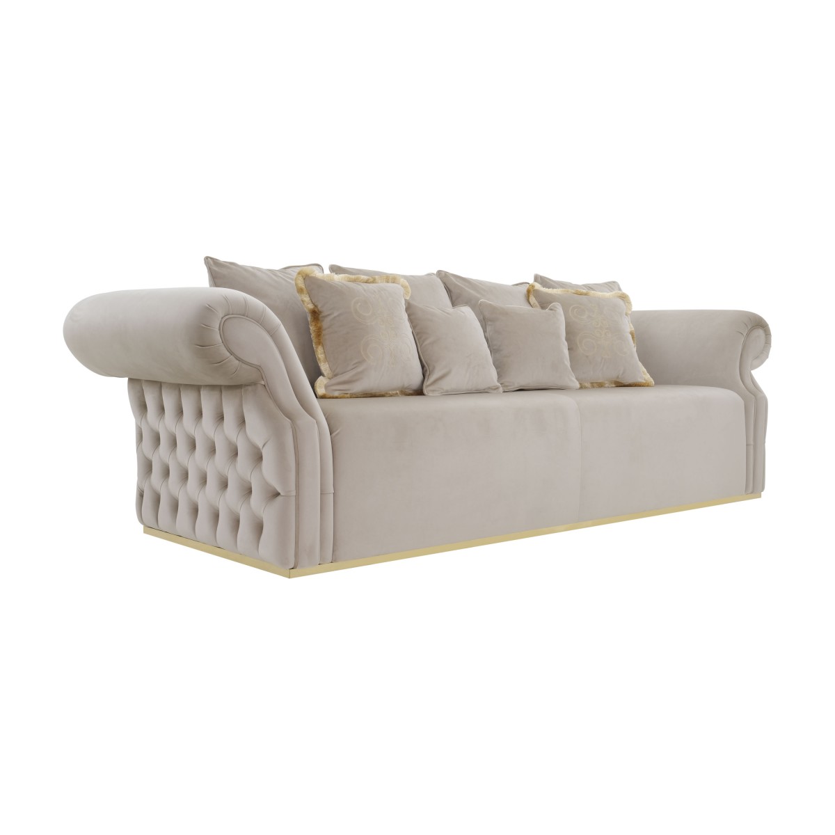 Elegant Classic style three seat sofa with rather original lines. The deep-buttoned outer part makes this sofa stand out among our products. The sofa is upholstered with webbing and superior quality foam and has six decorative cushions. The metal part that characterize the base of the sofa is highly appealing and the finish be selected from those available.
