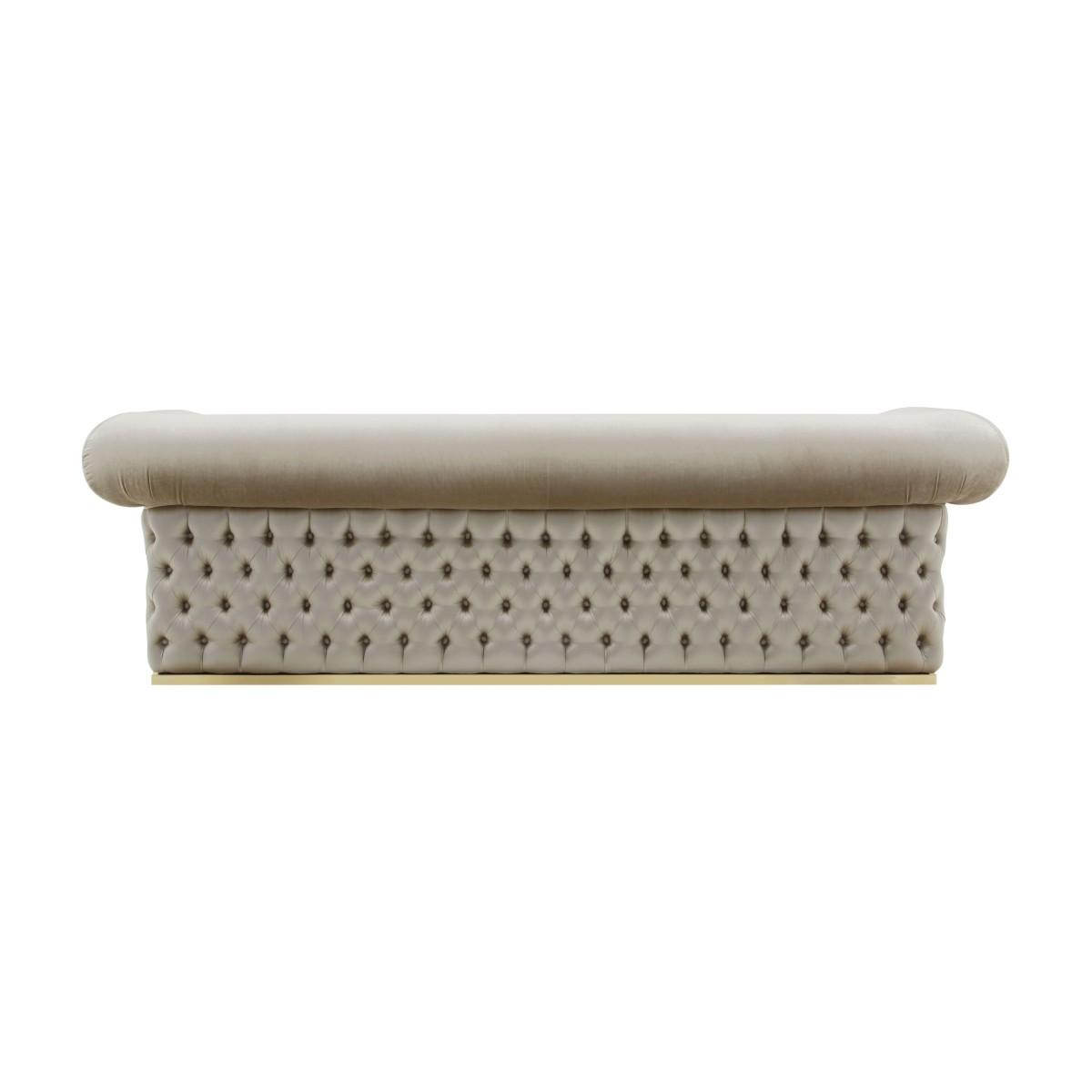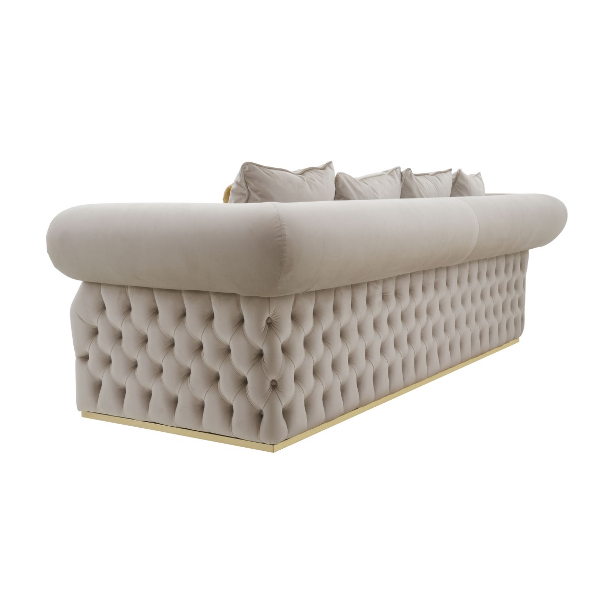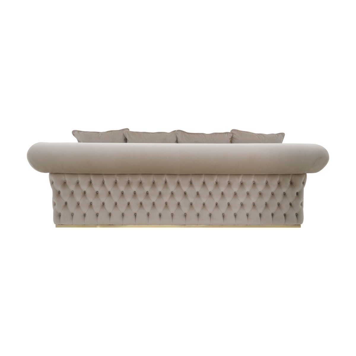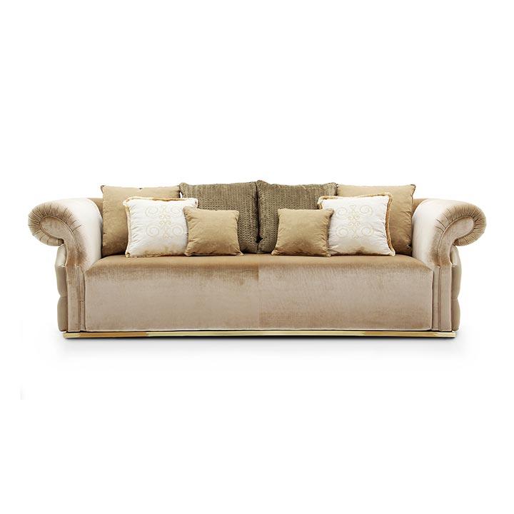 Elegant Classic style three seat sofa with rather original lines. The deep-buttoned outer part makes this sofa stand out among our products. The sofa is upholstered with webbing and superior quality foam and has six decorative cushions. The metal part that characterize the base of the sofa is highly appealing and the finish be selected from those available.