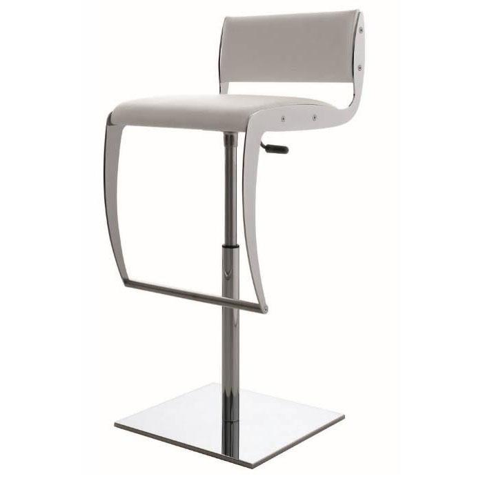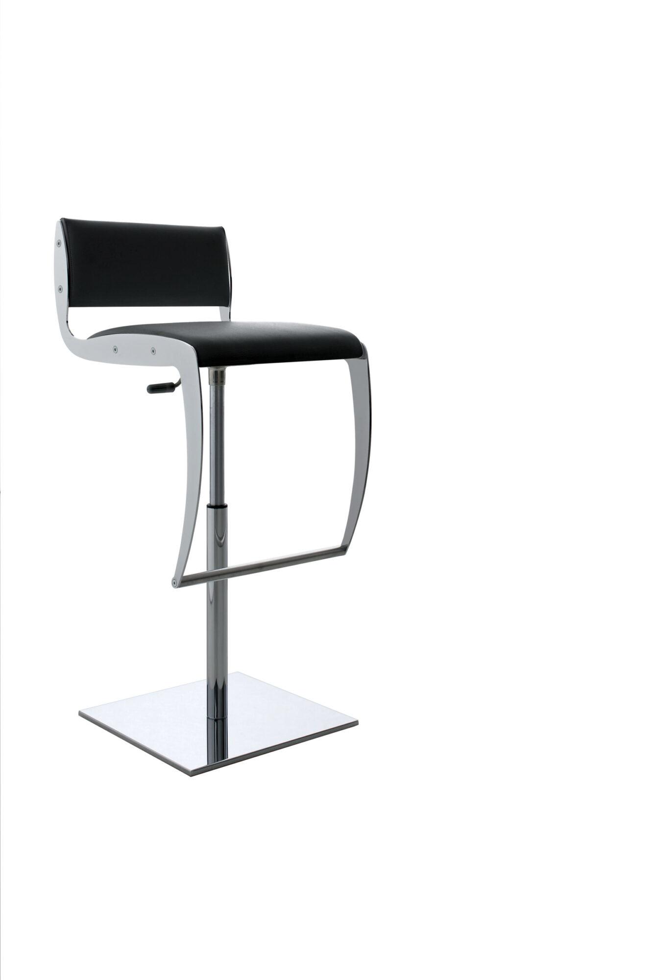 Yumi Stool Adjustable and swivel stool with chromed frame. Seat and back covered with white or black imitation leather, matched stitching. Square base in satinized steel. Overall Dimensions; 15.8″ w. x 18.9″ d. x 22.1″/32.3″ h.